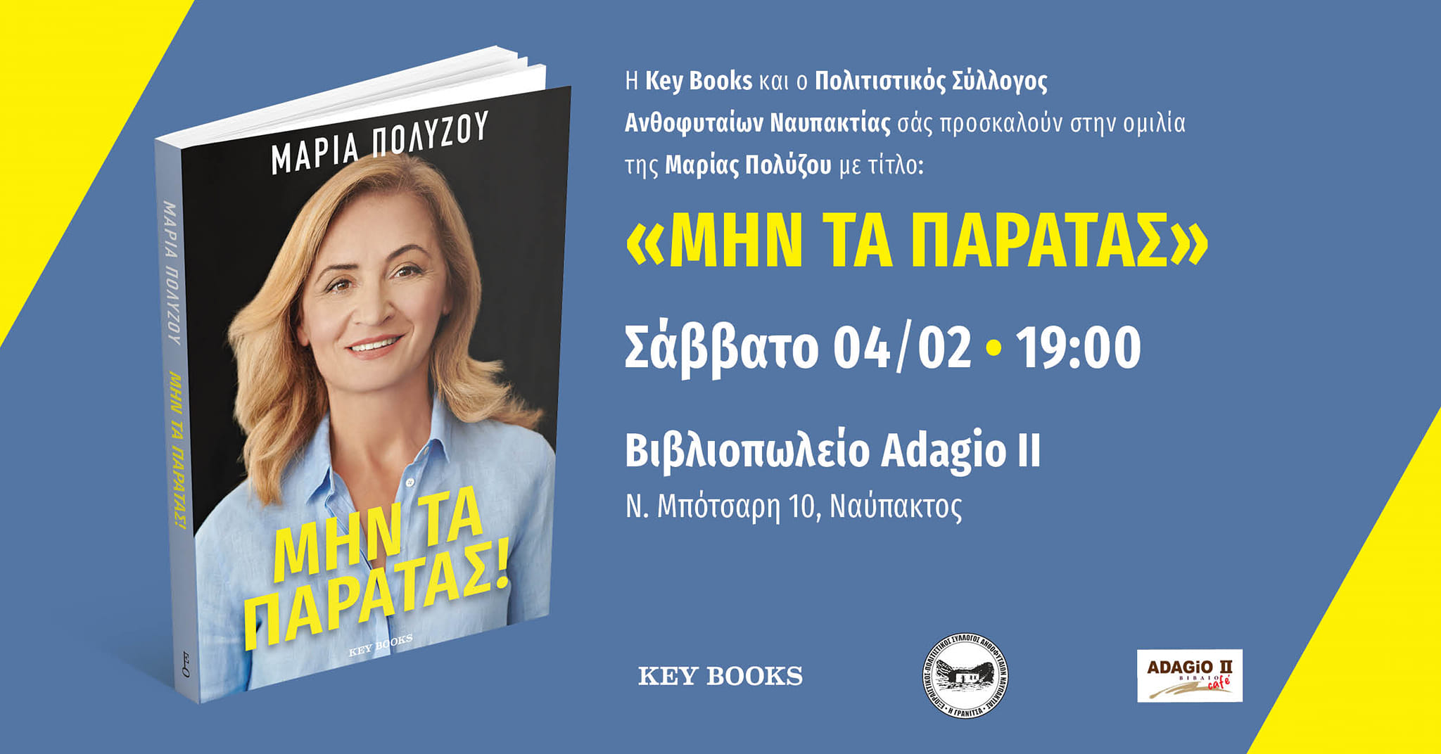Η Key Books και ο Πολιτιστικός Σύλλογος Ανθοφυταίων Ναυπακτίας σάς προσκαλούν στην παρουσίαση του βιβλίου της μαραθωνοδρόμου Μαρίας Πολύζου «Μην Τα Παρατάς», το Σάββατο 4 Φεβρουαρίου, στις 19:00, στο Βιβλιοπωλείο Adagio II (Ν. Μπότσαρη 10). ΤΟ ΒΙΒΛΙΟ ΘΑ ΤΟ ΒΡΕΙΤΕ ΕΔΩ: https://keybooks.gr/product/min-ta-paratas/   Η αυτοβιογραφία της Μαρίας Πολύζου είναι η ιστορία μιας γυναίκας που δεν […]
